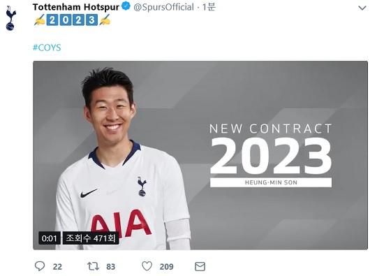 토트넘은 23일한국시간 홈페이지를 통해 손흥민과 새로운 4년 계약에 합의한 것을 기쁜 마음으로 발표한다. 손흥민29이 토트넘과 4년 재계약에 합의했다. 레버쿠젠과 토트넘은 2200만 파운드약 402억원에 손흥민 이적에 합의했고 토트넘은 손흥민과 2020년까지 계약을 체결하면서 공격라인을 보강했다.